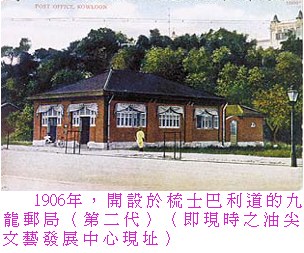 香 港 第 一 間 郵 政 局 位 於 「 政 府 山 」 聖 約 翰 教 堂 的 右 方 , 即 現 時 政 府 總 部 的 對 面 , 開 業 於 1841年 11月 。 1946年 遷 往 皇 后 大 道 中 與 畢 打 街 交 界 , 即 現 時 的 「 華 人 行 」 。 1860年 , 郵 政 局 的 正 式 名 稱 為 「 郵 政 總 局 」 , 但 實 際 上 仍 是 「 只 此 一 家 , 別 無 分 店 」 。 到 了 1898年 7月 , 才 一 口 氣 開 了 兩 間 分 局 , 一 間 位 於 上 環 , 另 一 間 位 於 尖 沙 嘴 九 龍 倉 內 。 1906年 , 九 龍 倉 內 的 九 龍 分 局 遷 往 水 警 總 部 旁 的 梳 士 巴 利 道 , 1927年 再 遷 往 火 車 站 鐘 樓 旁 。 第 三 代 郵 政 總 局 於 1911年 落 成 於 德 輔 道 中 、 畢 打 街 及 干 諾 道 中 的 新 填 地 , 即 現 時 的 「 環 球 大 廈 」 , 1976年 , 再 遷 往 康 樂 廣 場 的 現 址 。 位 於 皇 后 大 道 東 的 灣 仔 郵 局 則 落 成 於 1915年 , 這 古 典 的 建 築 物 在 1990年 代 改 作 「 環 保 軒 」 , 在 拜 訪 聖 雅 各 福 群 會 時 , 不 妨 順 路 欣 賞 於 該 會 附 近 古 建 築 , 環 保 軒 是 歡 迎 入 內 參 觀 的 。