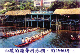由 1906 年 起 , 本 港 每 年 皆 有 「 賽 鬥 游 水 」 ( 渡 海 泳 ) 活 動 , 是 由 尖 沙 咀 水 警 總 部 碼 頭 , 游 至 中 環 太 古 洋 行 ( 後 來 的 富 麗 華 酒 店 ) 岸 邊 , 即 現 今 的 AIG Tower 。 1911 年 , 中 華 游 樂 會 在 銅 鑼 灣 七 姊 妹 ( 即 現 今 的 英 皇 道 ) 租 用 海 灘 一 段 , 供 會 友 游 泳 , 建 有 竹 橋 水 亭 及 浴 房 , 並 僱 有 教 練 二 人 。 1913 年 , 定 例 局 ( 即 現 今 的 立 法 會 ) 商 議 在 七 姊 妹 及 西 環 設 公 眾 泳 棚 , 電 車 公 司 大 表 支 持 。 此 時 , 已 有 一 泳 多 利 游 泳 池 及 泳 棚 設 於 美 利 道 海 軍 船 塢 旁 。 1918 年 落 成 , 位 於 必 列 者 士 街 的 青 年 會 內 , 亦 設 一 標 準 泳 池 。 1921 年 , 政 府 闢 昂 船 洲 海 灘 為 泳 場 , 並 在 該 處 及 佐 敦 道 建 一 竹 碼 頭 , 以 方 便 泳 客 。 同 時 關 閉 部 份 七 姊 妹 泳 灘 , 以 興 建 發 電 廠 ( 現 今 城 市 花 園 一 帶 ) 。 但 到 了 1930 年 , 有 華 人 、 南 華 、 中 華 及 文 員 等 體 育 會 、 永 安 、 太 古 及 大 新 等 公 司 在 七 姊 妹 設 立 泳 棚 。 除 西 環 的 鐘 聲 泳 棚 外 , 所 有 泳 棚 均 不 歡 迎 塘 西 的 妓 女 入 內 。 同 時 , 荔 枝 角 灣 亦 為 港 人 的 游 泳 地 點 , 戰 後 , 設 有 東 方 、 中 青 及 華 員 泳 棚 。 早 於 1928 年 , 紅 磡 大 環 山 已 設 有 泳 池 及 泳 灘 , 供 公 眾 游 泳 。
